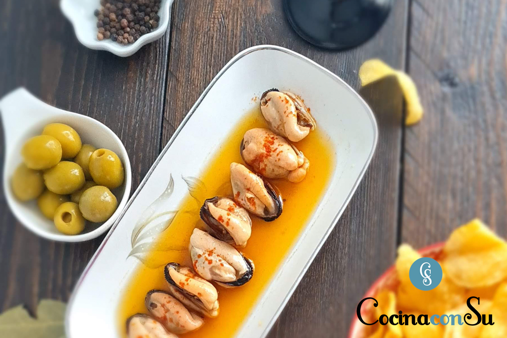 Limpiar los mejillones tal y como os expliqué en mi recetas de mejillones a la marinera https://cocinaconsu.com/2023/07/31/mejillones-a-la-marinera/ Una vez limpios poner un cacerola caliente al fuego y tapar. Pasados 3 mimutos aproximadamente , comprovaremos que los mejillones ya han abierto y ya podemos apartar la cacerola del fuego, destapar y dejar enfríar. Es importante que esten abiertos y inflados, pero sin que se pasen de cocción. Retiramos los mejillones de la concha con cuidado y los reservamos a parte. Colamos el caldo de cocción y reservamos. Mientrastanto, cortaremos las verduras en juliana y las pondremos en un cazo de unos 20 cm de diámetro aproximadamente, junto con el AOVE , los granos de pimienta negra, los ajos y el laurel y un pellizco de sal. Dejamos confitar durante 45 minutos aproximadamente, a fuego muy bajo. Pasado este tiempo, añadimos el pimentón rojo ( que no debe quemarse) el vinagre y el caldo de cocer los mejillones. Le damos un hervor y dejamos que se enfríe . Cuando esté templado, colamos el jugo separando las verduras, disponemos en un recipiente hermético de cristal los mejillones y cubrimos con el jugo del escabeche , reservamos las verduras para otra preparación y conservamos los mejillones en el frigo un mínimo de 24 horas. En este punto ya estan listos para consumir.